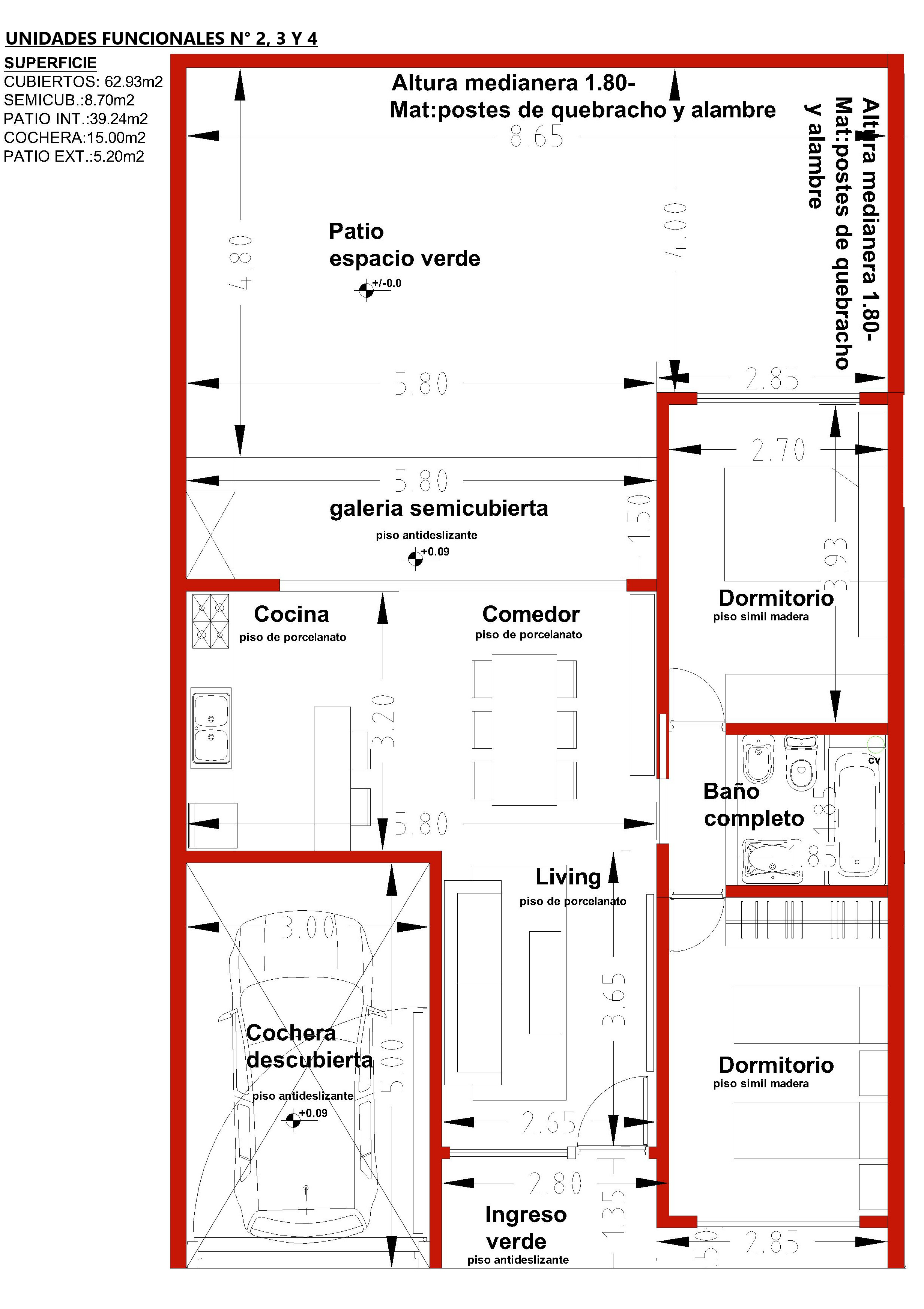 El desarrollo se integra por 4 unidades de 2 dormitorios. Todas las viviendas cuentan con cochera y, excepto la unidad sobre esquina, disponen de galería con parrilla y jardín.