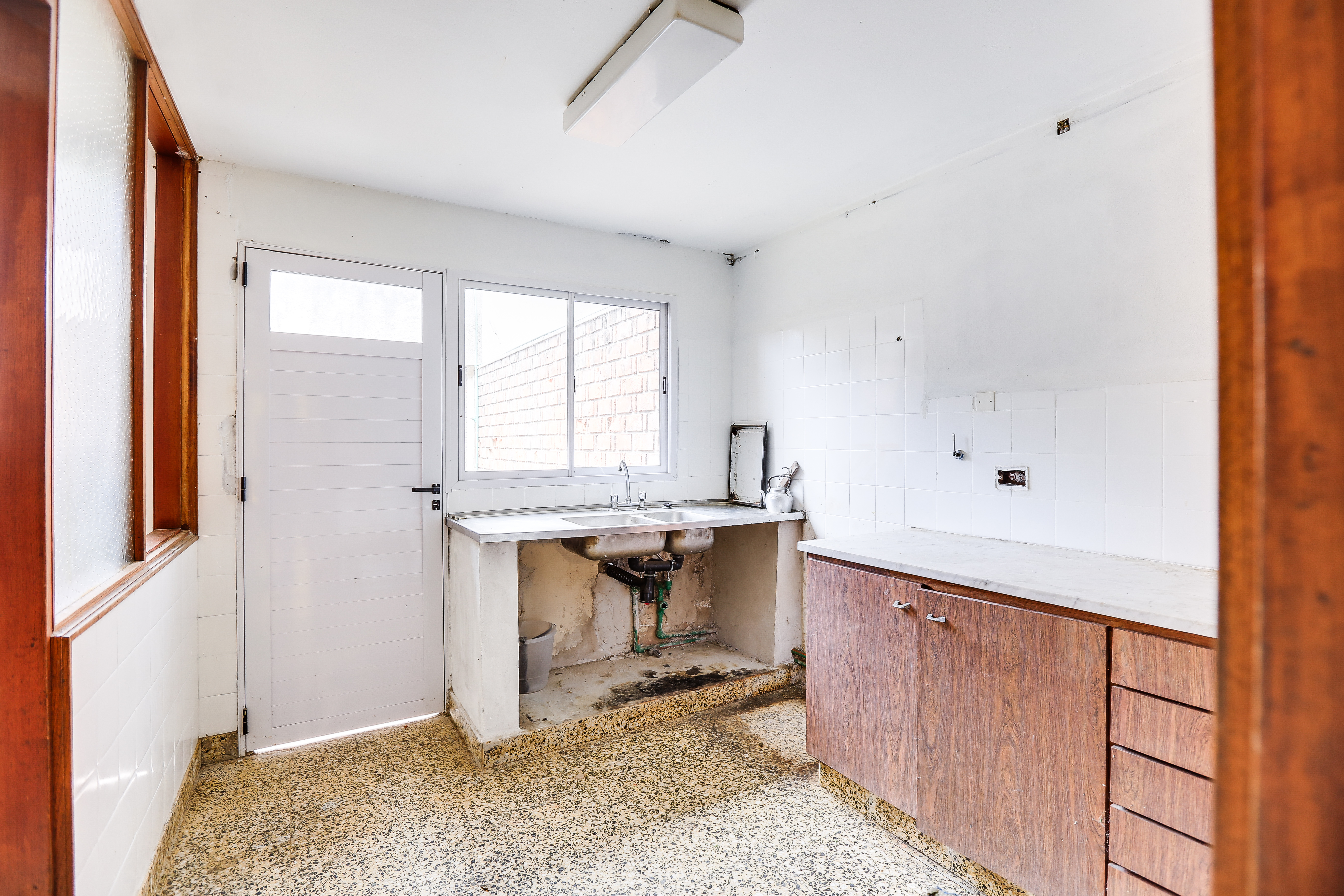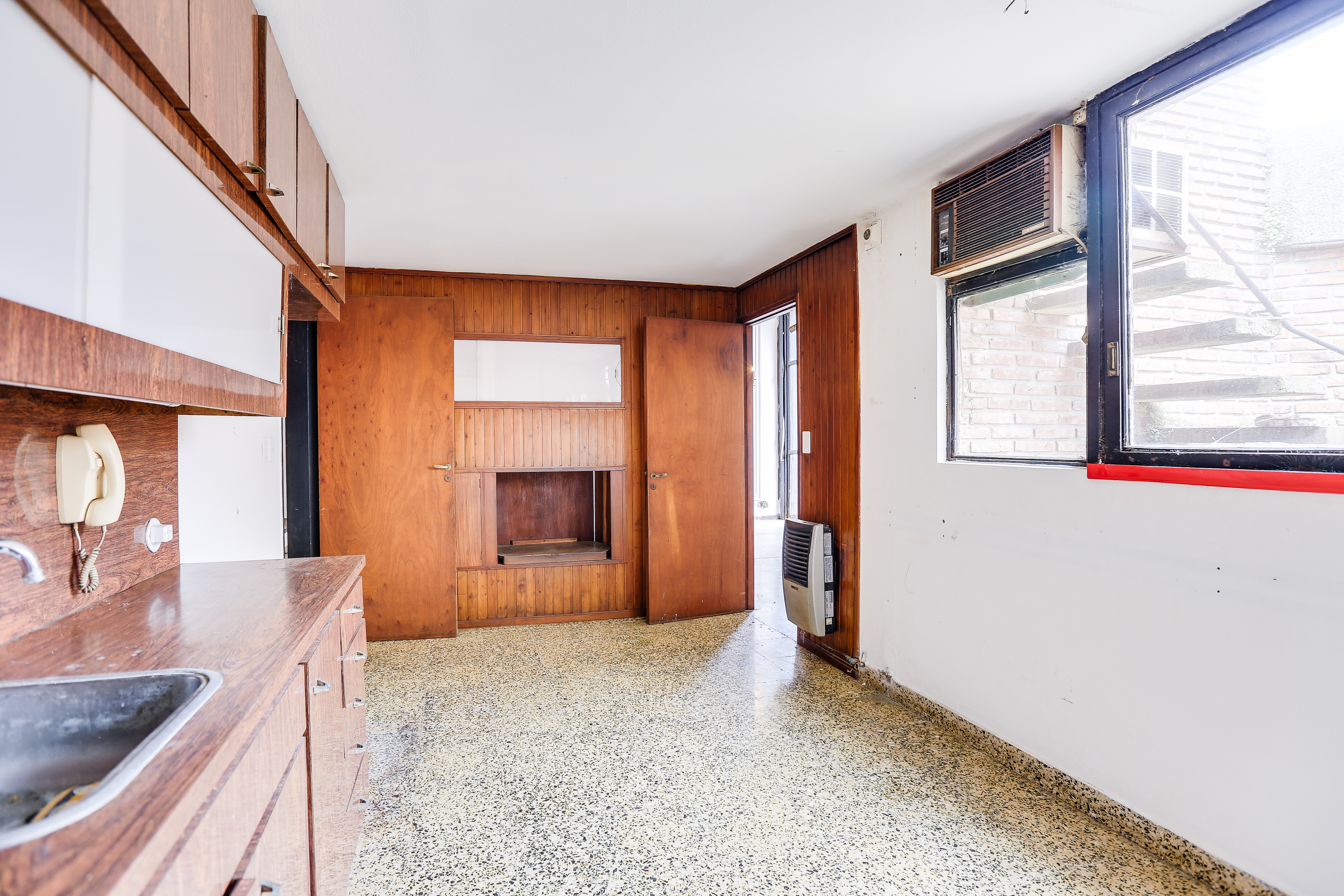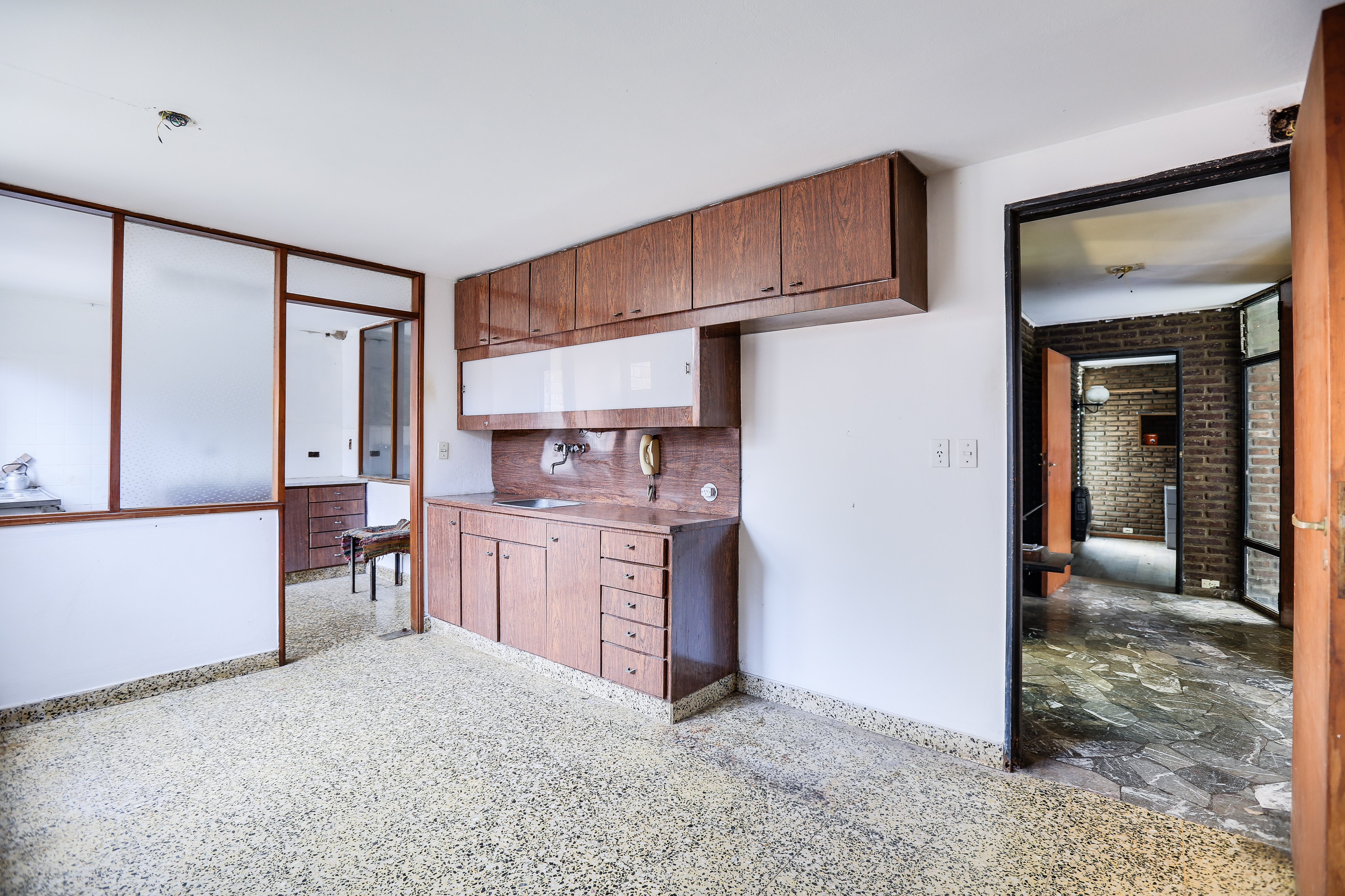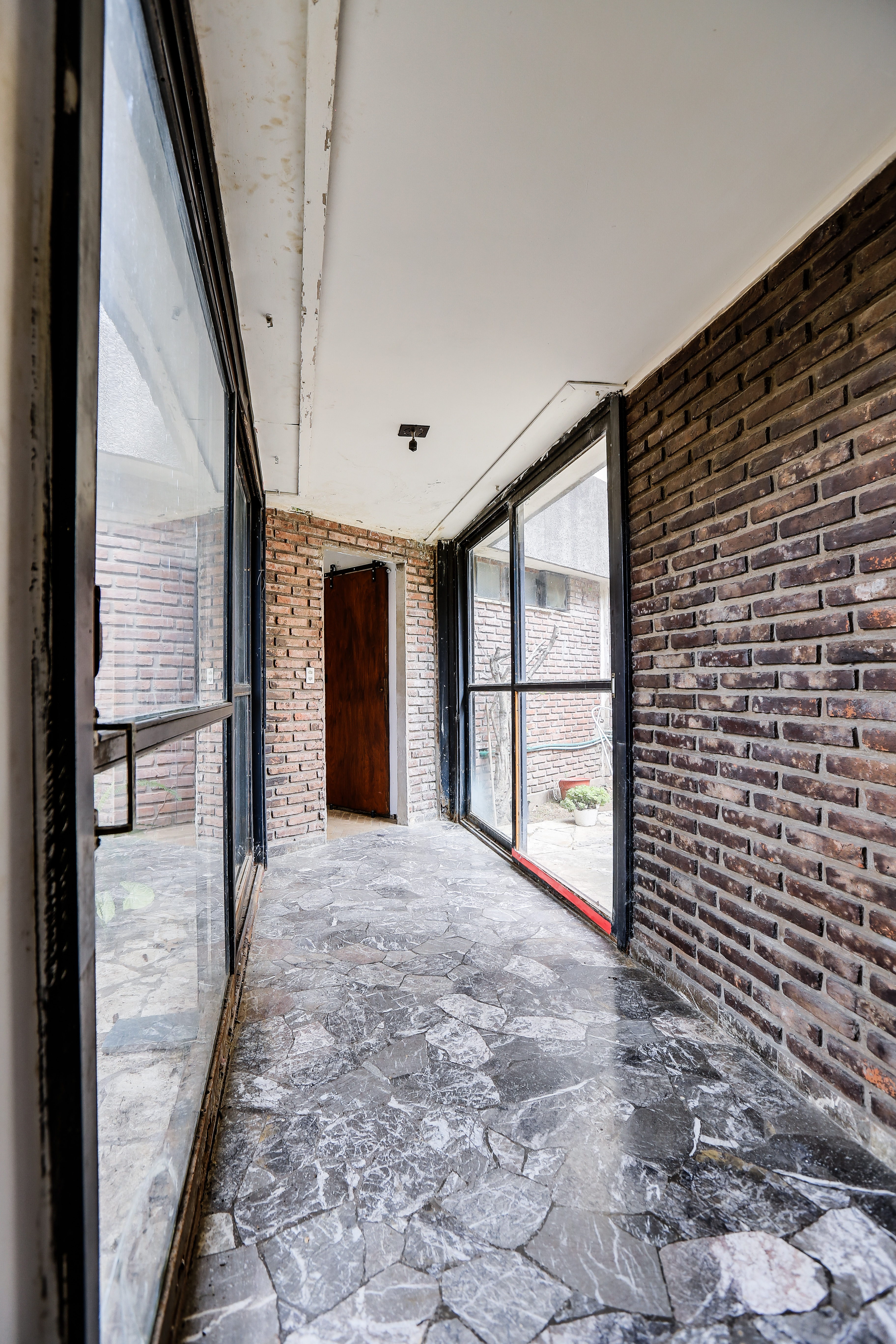 Cuenta con hall de ingreso, un escritorio, toilette. Cocina amplia separada, lavadero, living comedor, garage para dos autos. El sector de habitaciones esta separado de los espacios sociales por un corredor iluminado por ventanales de ambos lados, que de un lado lleva a un patio de luz interno con acceso a terraza, y por el otro lateral conecta con un amplio jardín con parrilla y espacio de guardado o posible taller.
