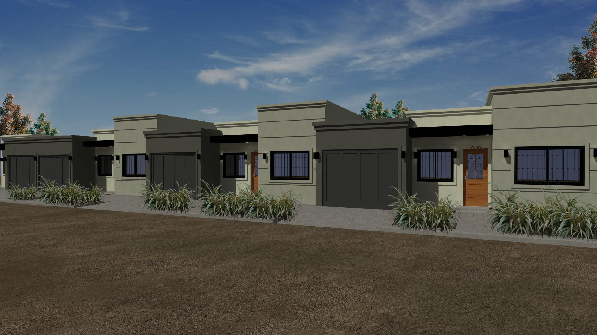 El desarrollo se integra por 4 unidades de 2 dormitorios. Todas las viviendas cuentan con cochera y, excepto la unidad sobre esquina, disponen de galería con parrilla y jardín.