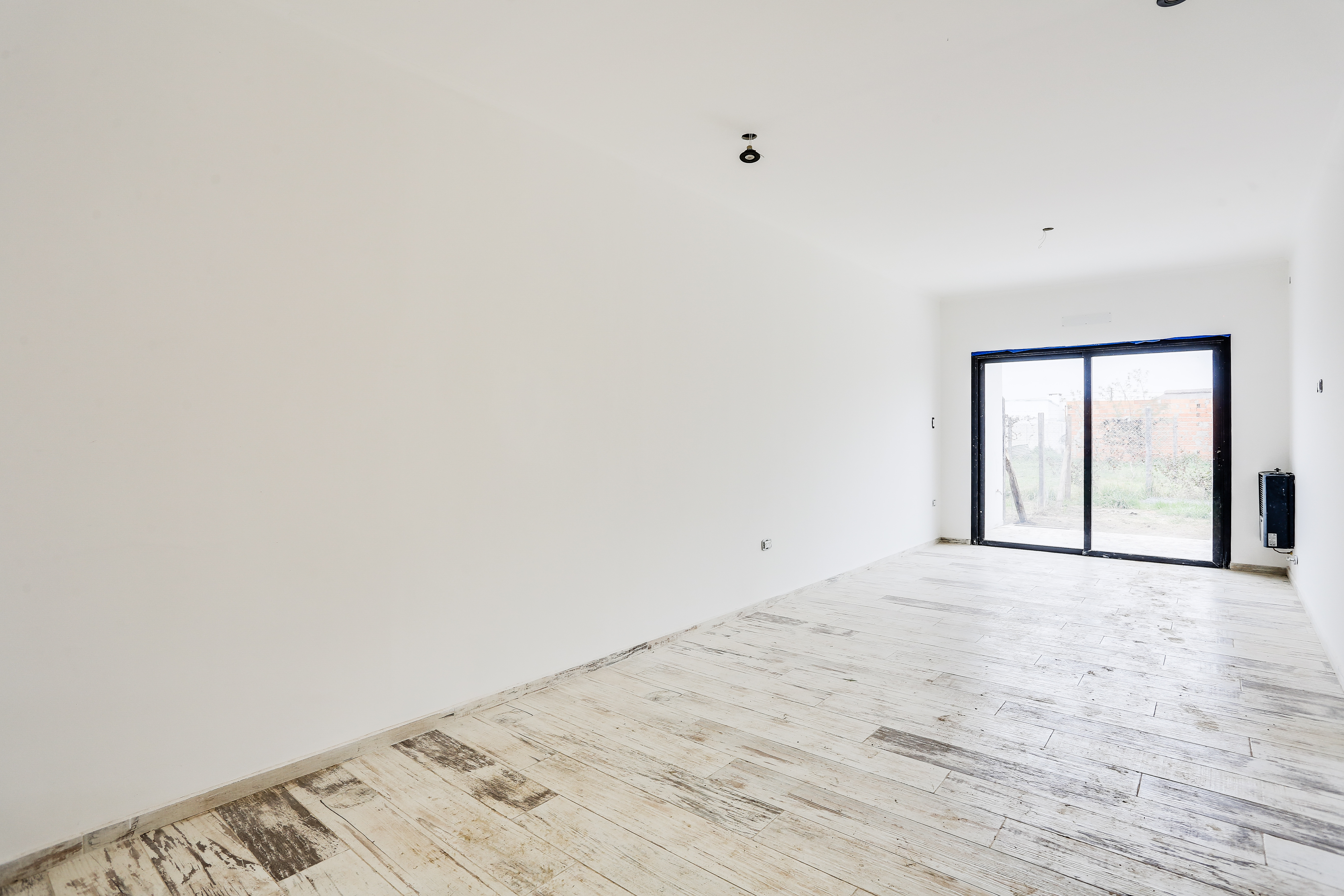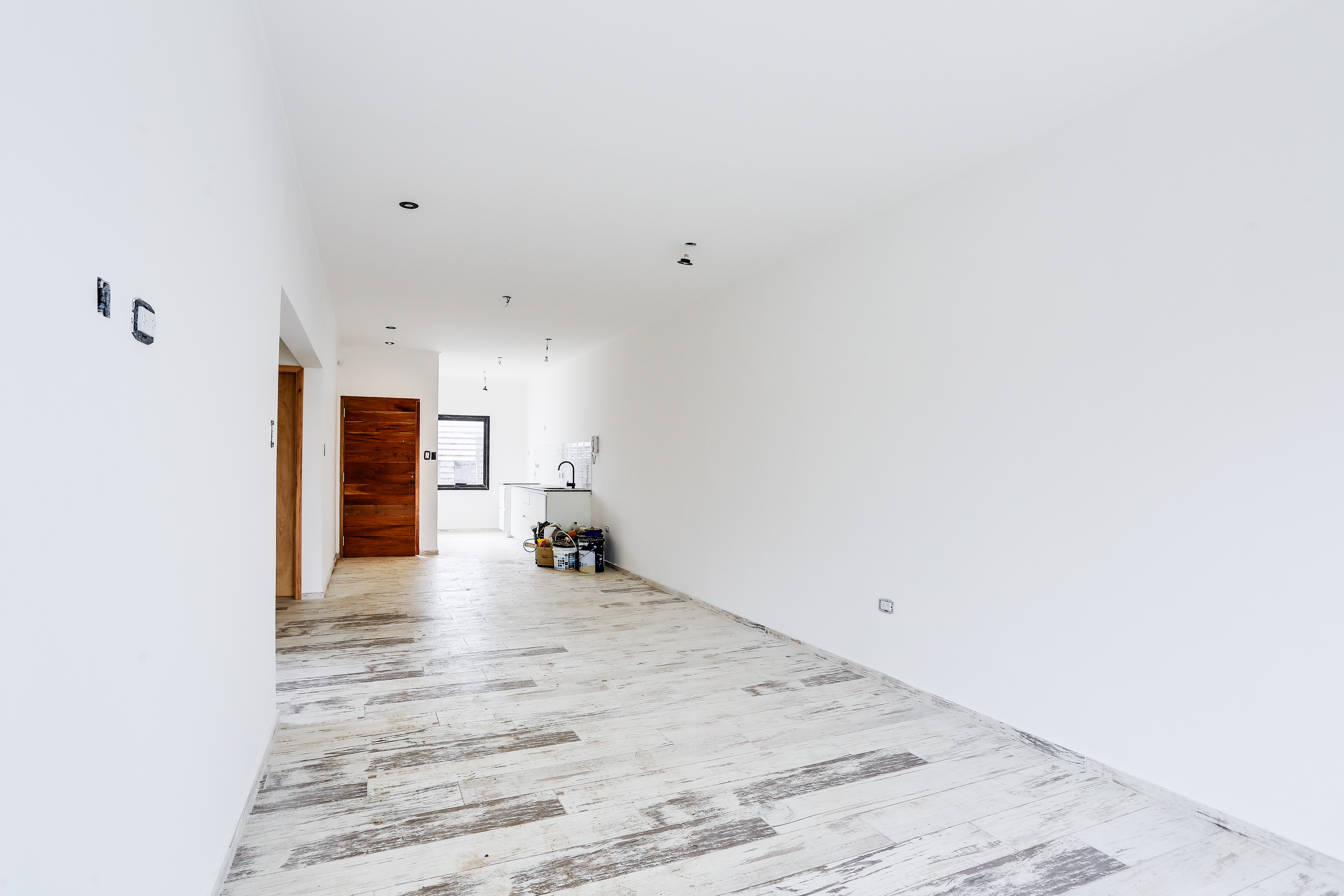 Cocina semi integrada, comedor y living integrados, dos dormitorios, baño completo, patio de luz, galería con parrilla, jardín y cochera descubierta para 1 vehículo.